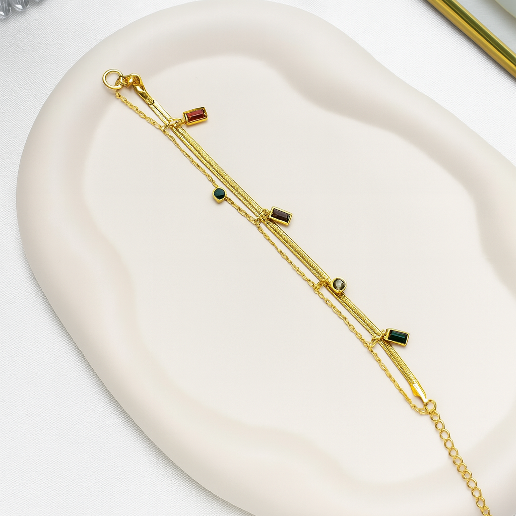 Make room on your wrist for the ultimate style statement: the Dazzle Stacks Bracelet. This double-layered beauty brings together sleek gold chains and pops of colorful baguette and round stones that twinkle with every move.