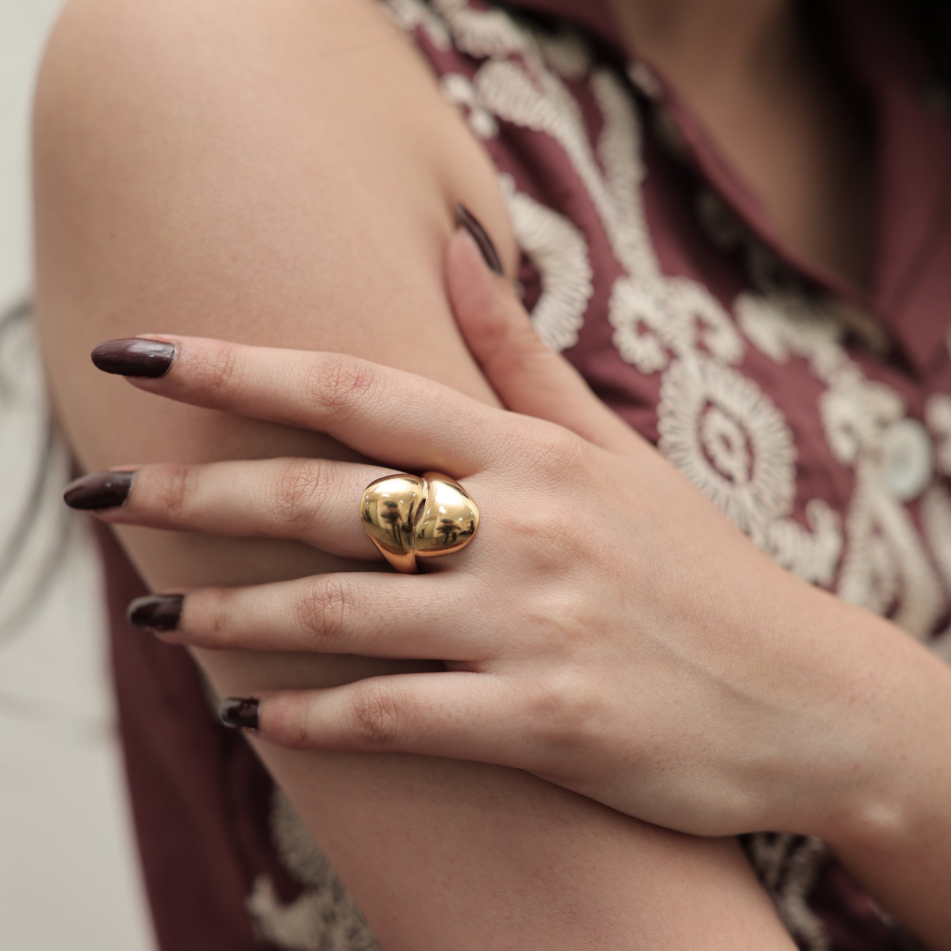 Introducing the Gilded Crest Ring, a bold sculptural masterpiece from the Withuss Anti-Tarnish Jewelry Collection. Designed with a powerful dome-shaped silhouette and a sleek center slit, this ring embodies modern elegance with a nod to organic, flowing design.